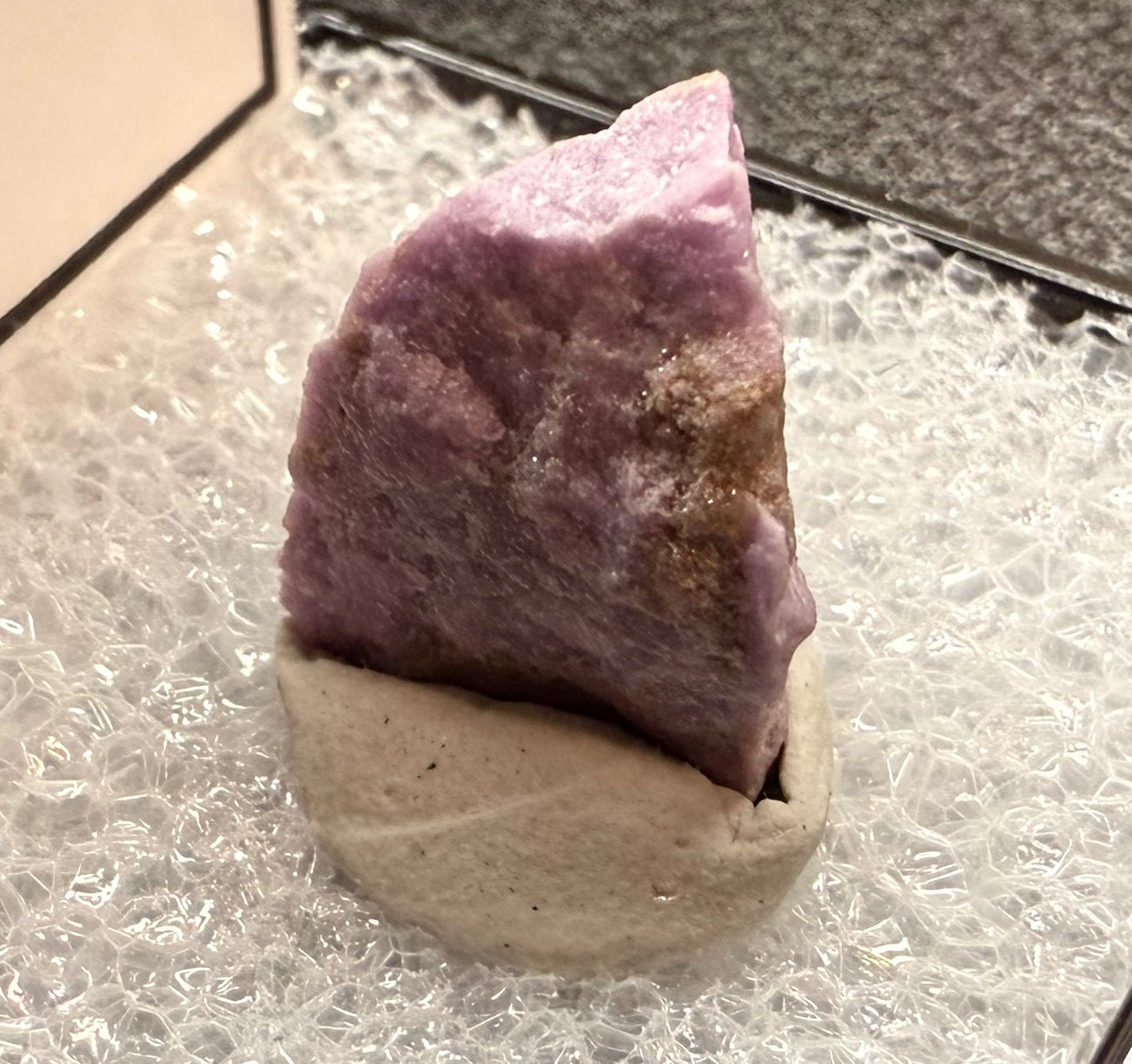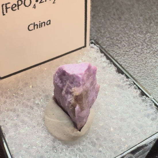 A compact miniature specimen of phosphosiderite in massive form. The deep purple color reflects its manganese phosphate composition, typical of secondary mineralization in oxidized, manganese-rich deposits. Stable and opaque to semi-translucent at thin edges, this piece is ideal for study or inclusion in a mineral collection.