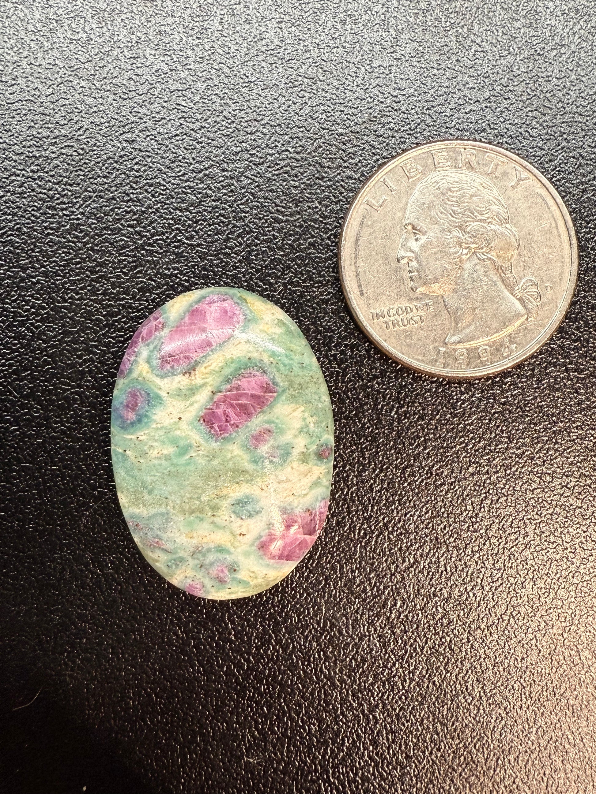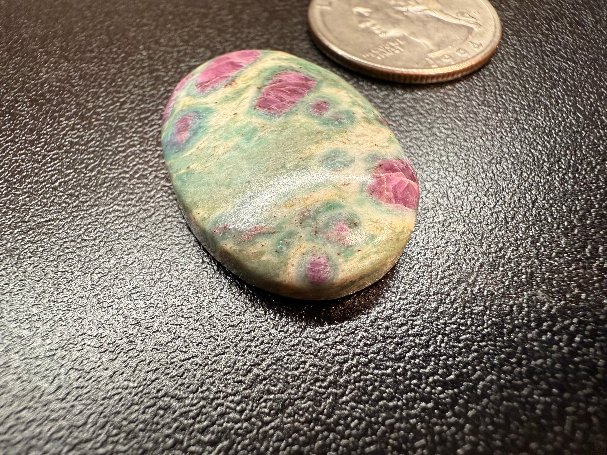 Beautiful high-contrast ruby-in-fuchsite cabochon showcasing well-defined corundum and bold blue kyanite rims. Quality rough like this is extremely uncommon — these cabs are cut from the only premium material I’ve ever managed to source.